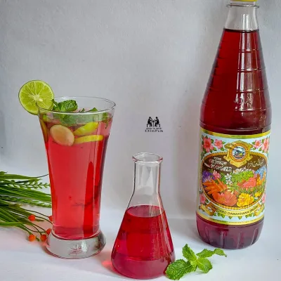 "Rooh Afza: a popular South Asian syrup known for its unique blend of floral and herbal flavors, typically mixed with water or milk to create a refreshing and rejuvenating beverage."
