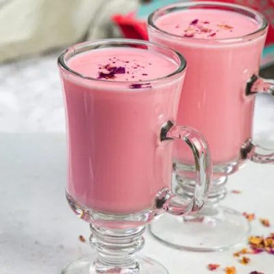 "Rose milk: a fragrant and creamy beverage made by blending rose syrup with chilled milk, creating a refreshing and indulgent treat with a hint of floral sweetness."